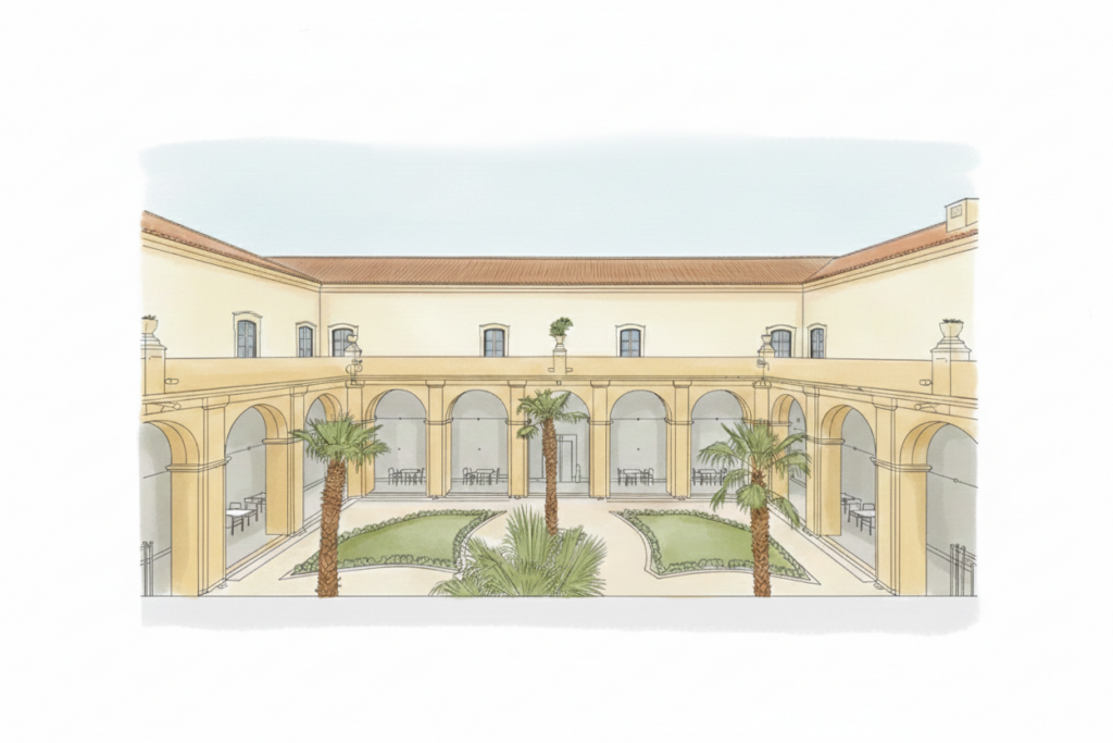 El claustro principal (donde seguramente se haga el cóctel o las fotos) fue diseñado para el silencio monacal. Debido a su arquitectura, a veces los sonidos rebotan de una forma curiosa: ¡puedes estar en una esquina y escuchar lo que alguien susurra en la esquina opuesta!